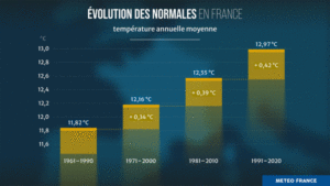 - (2) Le changement climatique, visible notamment par la hausse indéniable des températures (température moyenne annualisée sur l’ensemble du territoire passant de 11,8°c sur la période 1961-1990 à 13°c sur la période 1991-2020 – source MF), se traduisant par un asséchement plus marqué de la végétation et donc une sensibilité plus accrue au risque d’incendie.